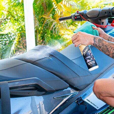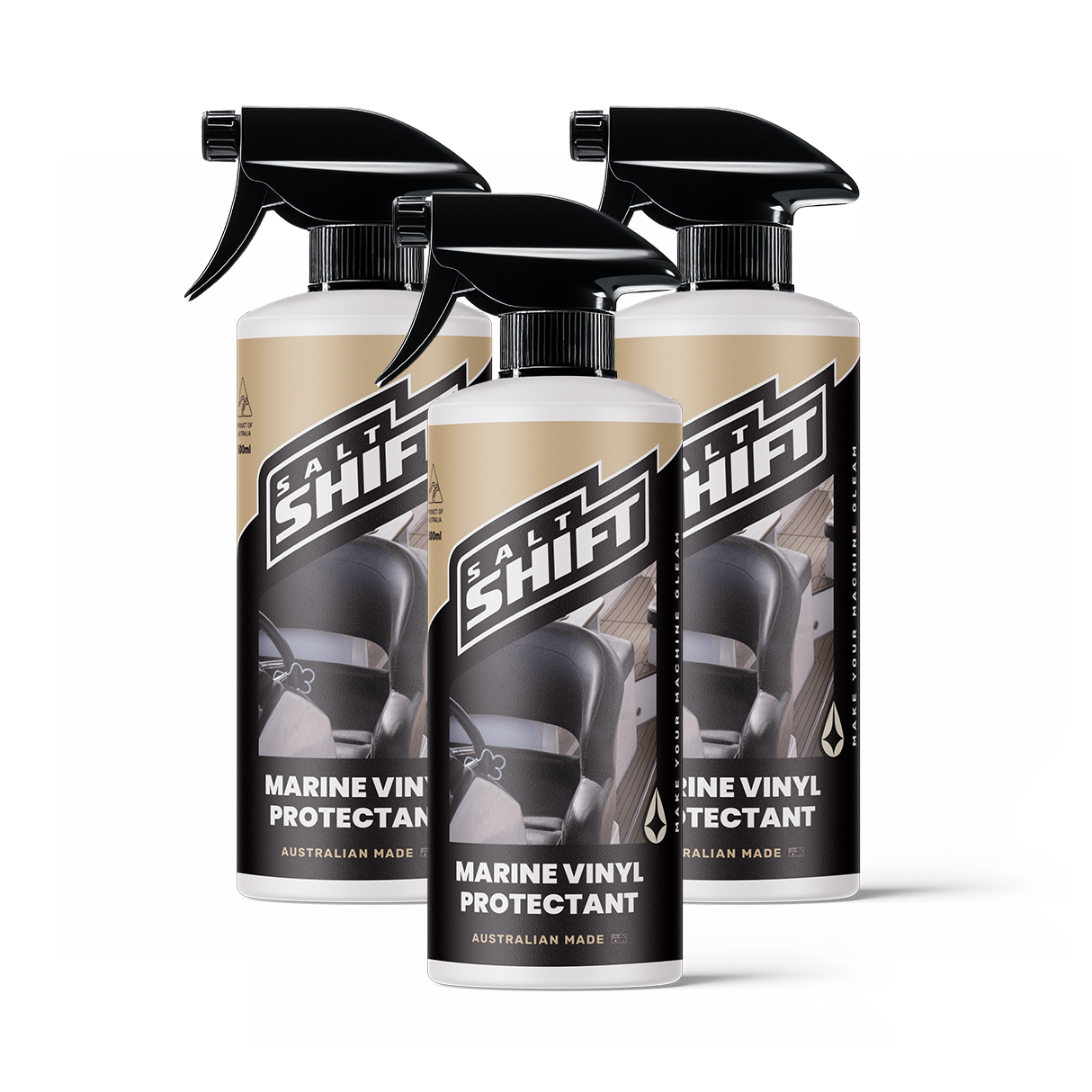 Salt Shift Marine Vinyl Protectant is designed specifically for the extreme marine conditions. It's the perfect solution to revitalise, condition and protect vinyl surfaces in your boats interior. Simply spray on and gently wipe to deliver lasting protection. Our advanced formula is non-greasy and leaves a premium satin gloss finish that will assist in protecting boat or pwc seats & upholstery against UV, mold, mildew, sun tanning oil, Food and Beverage Stains. Each bottle is 500ml / 16.9 fl oz.