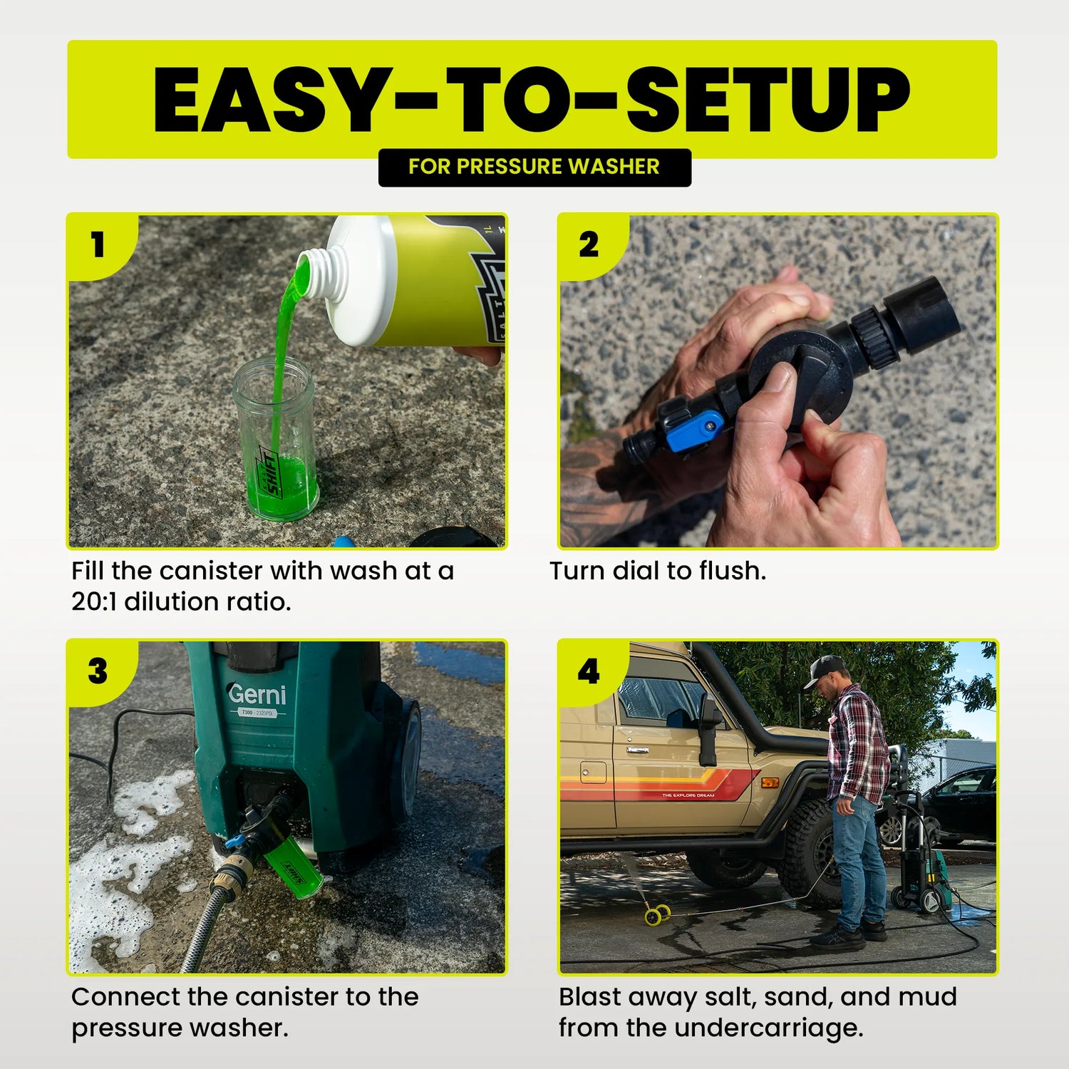 Plug and flush with the Salt Shift Universal Flusher Canister. Used to apply Salt Shift formulas for multiple applications. Simply plug the mixer into your ear muffs, PWC flush line, pressure washer or chassis flush kit and let the flusher do the rest.